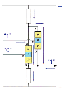логике транзистор включен так, что нулевое или положительное напряжение кодирует